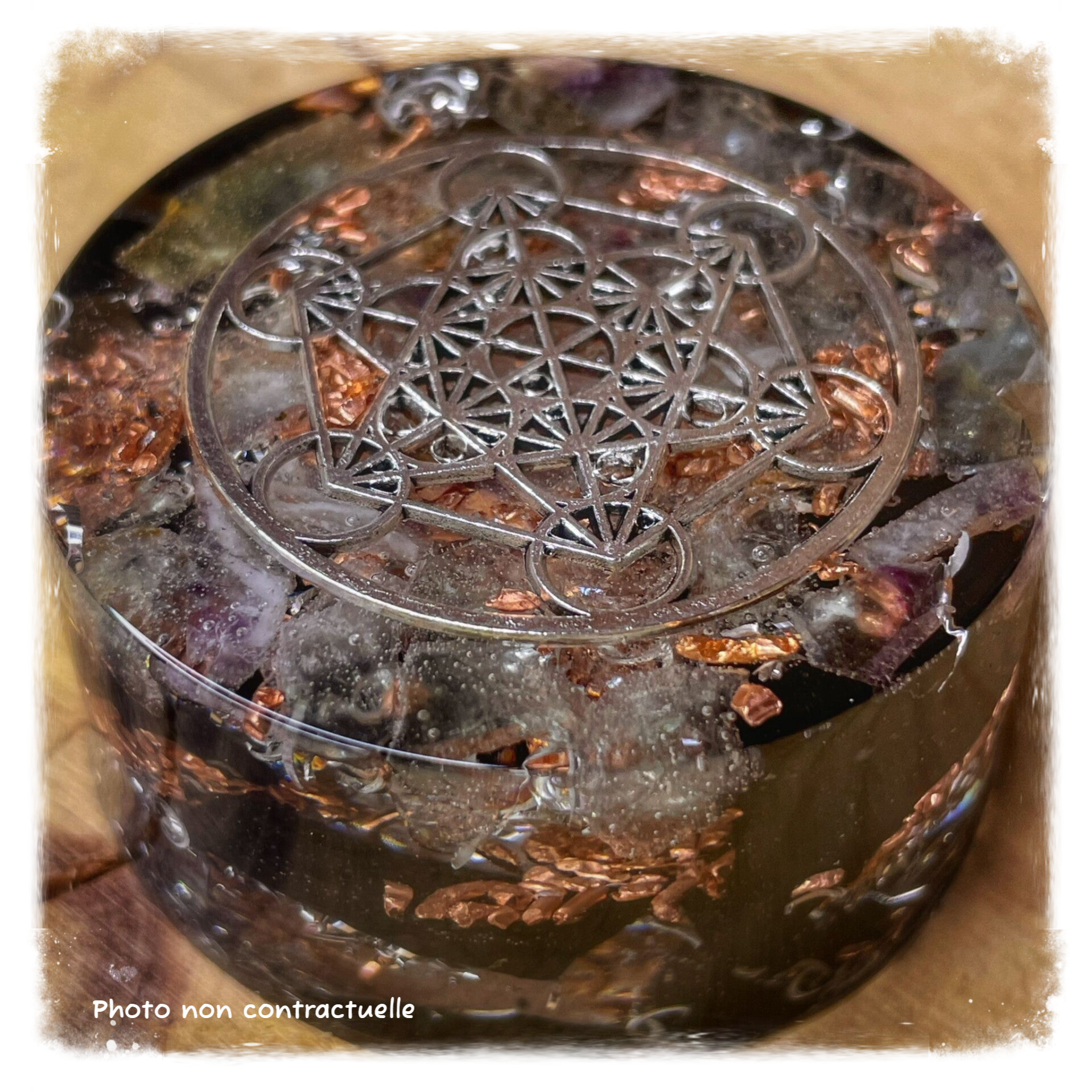 Palets de 6 cm de diamètre sur environ 2,5 cm de hauteur, ces orgonites sont composées d'une pointe de quartz, de shungite, de fluorite, de cristal de roche, de copeaux de métaux.