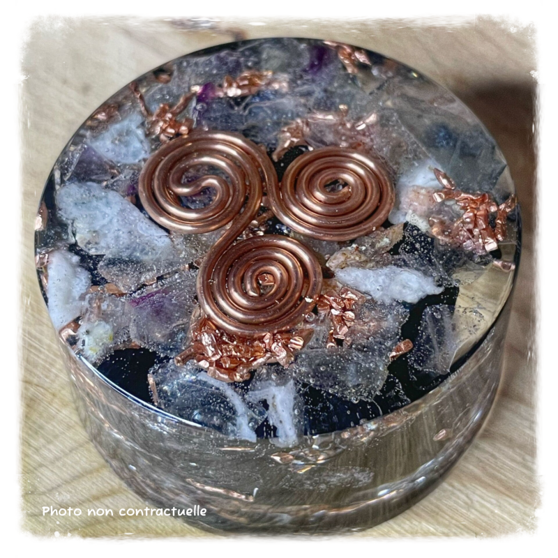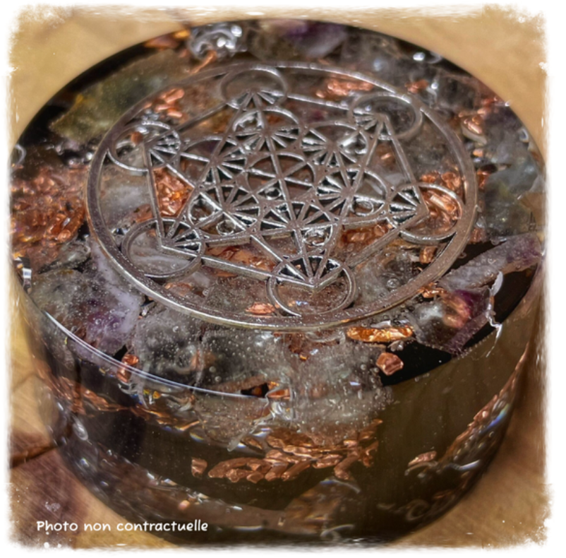 Palets de 6 cm de diamètre sur environ 2,5 cm de hauteur, ces orgonites sont composées d'une pointe de quartz, de shungite, de fluorite, de cristal de roche, de copeaux de métaux.