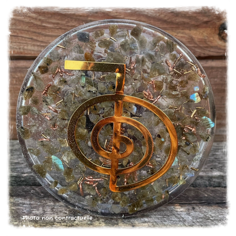 Véritable orgonite composée d'une pointe de quartz, d'une onde de forme, de pierres, de métaux et de résine, votre plateau associe l’effet orgonite à l’effet dynamisant de l’onde de forme.